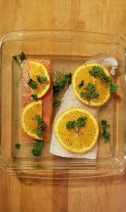Place white wine and juice of ½ an orange in baking dish. Add few grinds of black pepper. Top with fish (Pic 1). Lay half slices of orange on top of fish, add more pepper and place in oven for 10 to 15 mins. Do not cover.