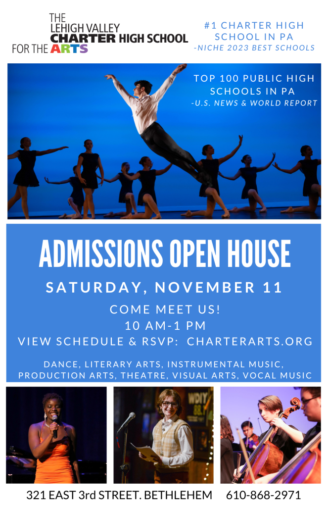 BETHLEHEM, PA– The Lehigh Valley Charter High School for the Arts (Charter Arts) will hold an Admissions Open House on Saturday, November 11th from 10 AM-1 PM. This event is a great first step for prospective students and families to learn more about the school’s rigorous curriculum, admissions process and more! Attendees will have the opportunity to tour the school facility, view a student performance and attend breakout sessions with directors of the school’s various artistic departments.