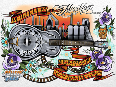 “We are thrilled with Dan’s design for this year’s Musikfest poster,” says ArtsQuest Director of Marketing Jon Lunger. “The opportunity to work with a visual artist in what many consider to be a non-traditional discipline is particularly appealing to us as it’s a reflection of the exciting and often surprising programming that’s presented at Musikfest each year. We’re looking forward to using this in so much of our marketing and our merchandise. This poster is a truly dynamic piece that represents the history and tradition of tattoo art, as well as the traditions of the festival, pushing towards the future of both.”