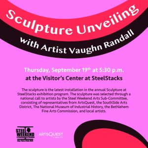 Bethlehem, Lehigh Valley, PA., September 16, 2024 – ArtsQuest and the Steel Weekend Arts Sub-Committee has selected Vaughn Randall for the 3rd Annual Sculpture at SteelStacks exhibition. Randall’s sculpture will be installed on Thursday, September 19 at 5:30 p.m. at the Visitor’s Center at SteelStacks.