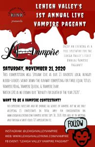 Este evento también se llevará a cabo virtualmente ya que Covid-19 todavía está en curso y para cumplir con los requisitos estatales del Departamento de Salud en materia de salud y seguridad. Solo los asistentes y miembros del personal registrados del concurso estarán permitidos en la ubicación. El evento también será transmitido en vivo virtualmente para aquellos en casa que están interesados en ver disfrutar de forma segura. Habrá un requisito de uso de máscara obligatorio durante el evento. Los concursantes del concurso deben tener 21 años o más y la cuota de inscripción es de $25 que incluye su presentación, un video de 3 a 5 minutos mostrando sus credos de vampiro y vampiro, las presentaciones deben vencer el 30 de septiembre. Tendremos solo 13 concursantes del concurso, por lo que si no es elegido como concursante, se le reembolsará la cuota de inscripción. Habrá tres ganadores rey vampiro, reina vampiro y vampiro EMBY. Para más información póngase en contacto con lehighvalleyvampire@gmail.com Síguenos en Instagram @lehighvalleyvampire
