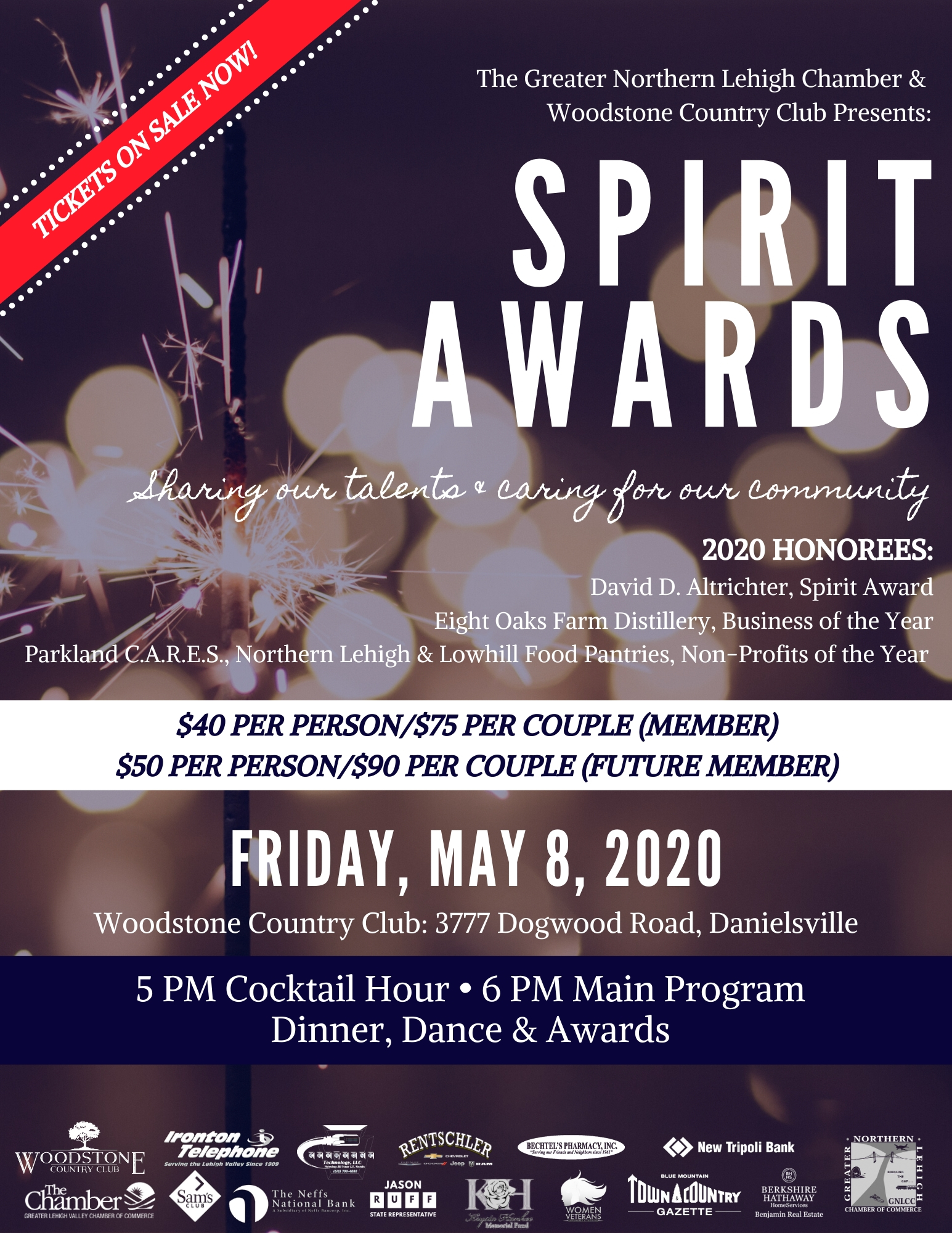 Also being celebrated at the 27th Annual Spirit Awards is Eight Oaks Farm Distillery (Business of the Year) and Parkland CARES Food Pantry, Lowhill Food Pantry, and Northern Lehigh Food Bank (Non-Profits of the Year). Attendees are encouraged to bring canned goods and donations for the food banks, which will be collected at the event and divided amongst the organizations, as well as cash for raffle tickets and 50-50! A portion of the proceeds will be donated to the food pantries, as well as benefitting the GNLCC Scholarship Fund.