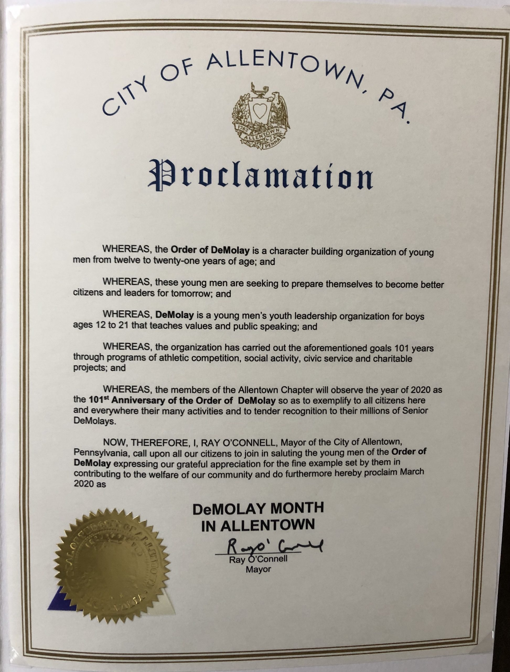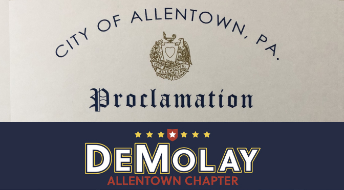 Allentown, PA, March 26, 2020 – Despite the current coronavirus pandemic, the Mayor of Allentown and the members of Allentown City Council presented Allentown DeMolay with Proclamations recognizing March as DeMolay Month in the City of Allentown and recognizing the 101st Anniversary of the founding of DeMolay.