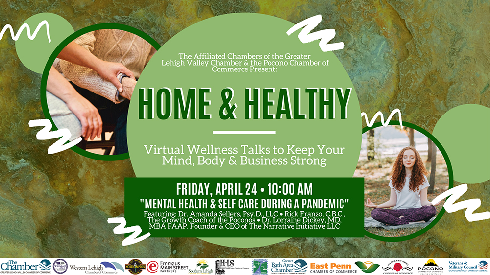 April 23, 2020 | Lehigh Valley, PA – The Affiliated Chambers of the Greater Lehigh Valley Chamber of Commerce is excited to announce a collaboration with the Pocono Chamber of Commerce to co-host a three-part Home & Healthy Webinar Series. This series will feature wellness talks to keep your mind, body, and business strong. As the world faces unprecedented changes to everyone’s personal and professional lives, it is more important now than ever before that we take action to protect each other’s mental and physical health, as well as take measures to maintain our own safety and security. Once a week for the next three weeks panelists will provide tips, tricks, resources, and exercises to webinar attendees on how to keep your mind, body, and business strong.