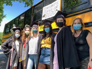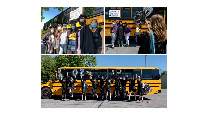 Due to a fundraising effort initiated by the school in early May, funds were raised to send graduation boxes to seniors a few weeks ago. The boxes included their cap and gown, a yard banner, and more! For “Park and Circumstance”, seniors and their families arrived to take pictures in front of the school bus with decorated caps, signs, and props.