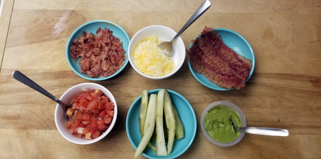 Here we have Chopped & Sliced Bacon, Shredded Cheeses, Salsa, Sliced Pickles, Guacamole.