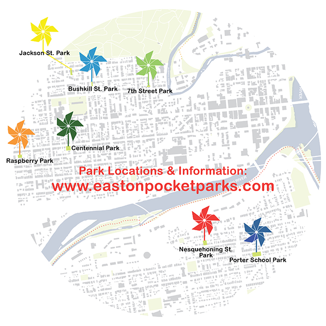 More than 1,000 colorful pinwheels will be installed in seven pocket parks around Easton’s West Ward and South Side neighborhoods this weekend as a kick off for the new Easton Pocket Parks Master Plan. The public art installation is being implemented by Easton–based design studio Omnes as part of a master planning project for the parks by the City of Easton. The seven parks are each about the size of a residential lot and were identified by the City as priorities for redevelopment due to being underserved and in need of improvements.