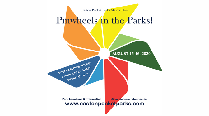 Visitors will be directed by signage to www.eastonpocketparks.com, the master plan’s online bilingual hub of engagement where they can complete a survey on each park individually or all seven. Visitors can walk away from each pocket park with their own pinwheel, and are encouraged to visit all the parks to collect a bouquet of colors. Pinwheels will be on view August 15-16, with installation completed the afternoon of Friday, August 14.