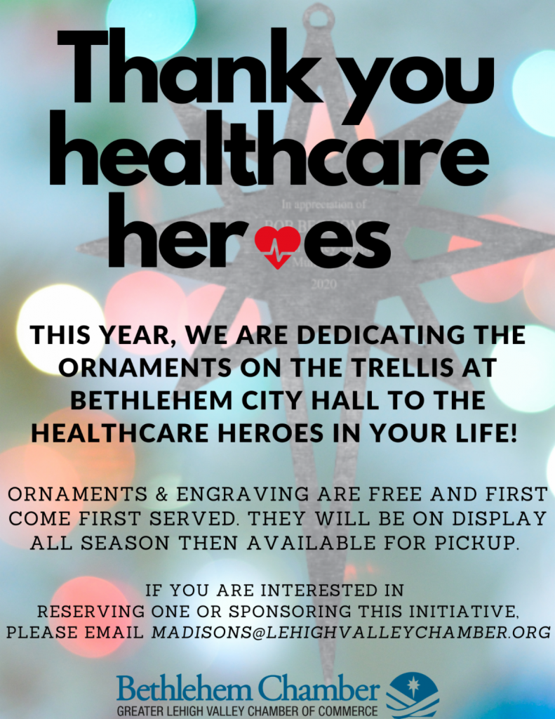 Bethlehem, PA: As of Black Friday, we invite you to visit the Christmas City Trellis at City Hall’s Payrow Plaza. This year the Trellis is dedicated to our local Healthcare Heroes who continue to work tirelessly to keep their community safe through this pandemic. This is an open air, socially distanced way to get out and enjoy the Christmas City while honoring our heroes. The ornaments will be on display from Black Friday through January 2nd. We encourage you to shop and dine downtown after visiting! If you are interested in reserving an ornament, visit this link: Lehigh Valley Chamber website.