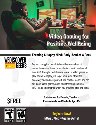 Are you struggling to maintain motivation and social connection during these times of crisis, panic, and social isolation? Trying to find streams to watch, video games to play, shows to replay just to get your mind off all the negativity and endulge yourself into another world? You are not alone. Video games, apps, and streaming can be a POSITIVE coping method when you know the pros and cons. Come learn the positives of utilizing geek entertainment at home, in the classroom, and in your careers.