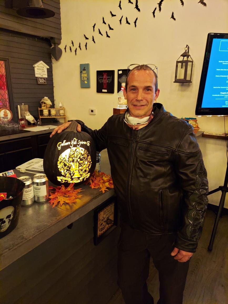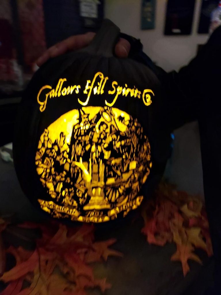 Gallows Hill Spirits Co. is owned by a descendant of “the soothsayer of Andover. A witch hanged in Salem in 1692.” Gallows Hill takes you back in time while introducing you to new spirits and new friends. Social distancing and masks were worn, (a lot of witch’s hats too.) People came out to listen to the Witch Trial Reading. It was energetic, fun and, theatrical. It was done outside and even with the mask on, you could see the happiness, the curiosity. Gallows Hill Spirits makes you feel as if you opened a door and walked through it and arrived in Salem. Witches hats, beautiful lighting, an AMAZING pumpkin carved by the talented, Jeff Donchez fb.me/JDPumpkinCarving