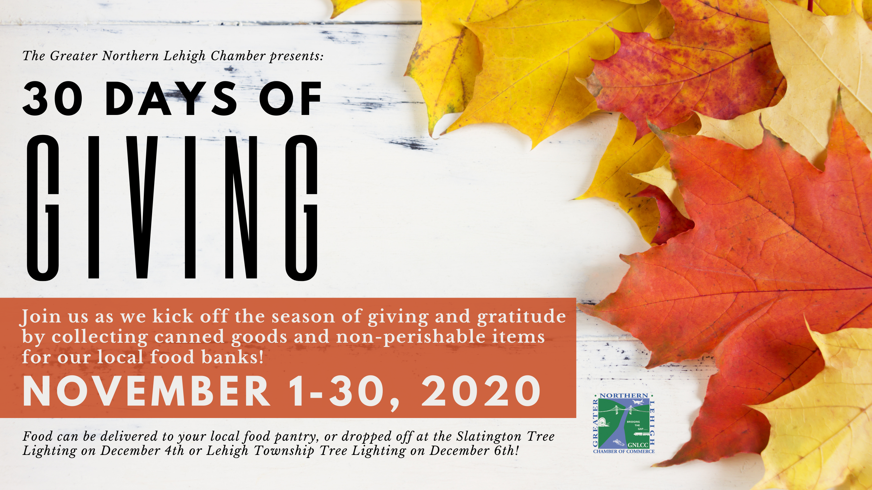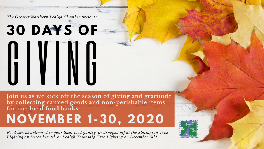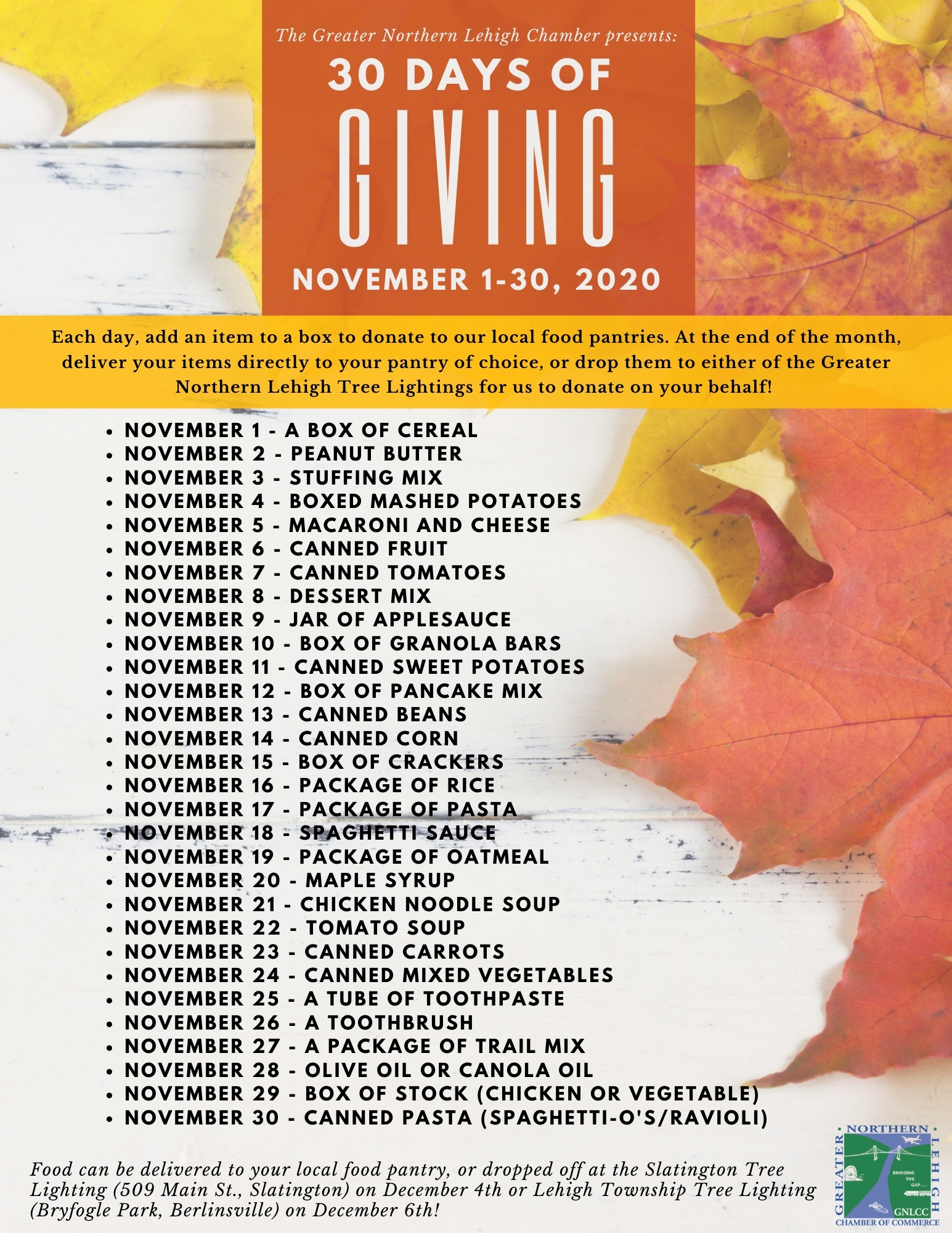 Kicking off the holiday season is the “30 Days of Giving” campaign to ensure all our neighbors have food on their tables this winter! Greater Northern Lehigh Chamber Board Member, Vickie Beller of Dimmich & Dinkelacker, presented the idea for a reverse advent calendar after seeing a post on social media and suggested a food drive for the month of November. “I really like the items suggested in the ‘30 Days of Giving’ list because none of them cost a ton of money to collect and make a big impact.”