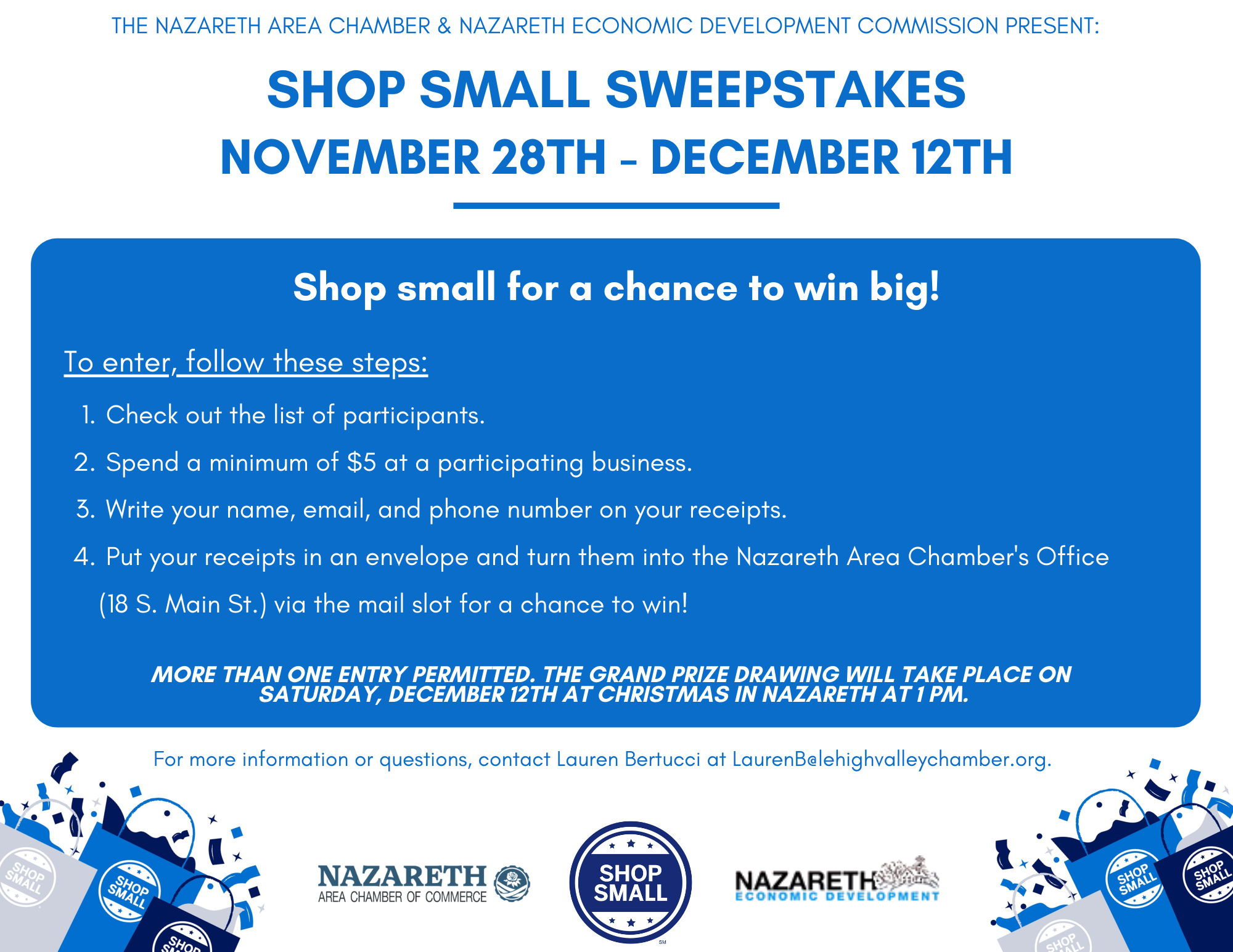 Shop Small Sweepstakes: The sweepstakes will take place from Saturday, November 28th – Saturday, December 12th. To be entered in the grand prize drawing, participants can submit their receipts (must be for a purchase of $5 or more) to the Nazareth Area Chamber Office via the mail slot, 18 S. Main St. Nazareth, PA 18064. For additional rules and information, click here.