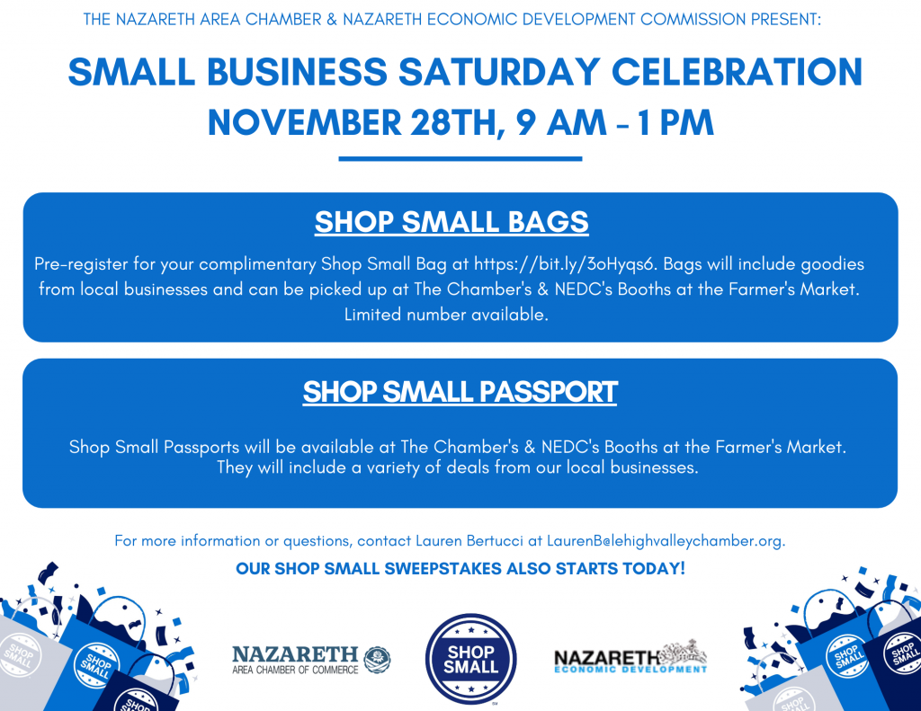 On Saturday, November 28th, from 9 AM – 1 PM, guests can visit the Nazareth Area Chamber’s & NEDC’s booths at the Nazareth Farmers Market for a complimentary Shop Small Bag and Shop Small Passport. The Shop Small Bags will be filled with a variety of items and coupons from local businesses. Preregistration is encouraged as a limited number of bags will be available and they will be distributed on a first-come-first-serve basis. Click here to reserve yours today. Our Shop Small Passport will also showcase those who are offering a special in celebration of Small Business Saturday. Stay tuned for more details!