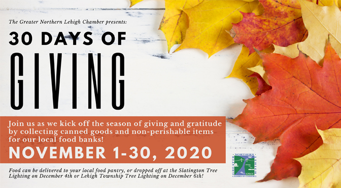 For more information on the “30 Days of Giving” and for other upcoming Greater Northern Lehigh events, please visit their Facebook Page at www.facebook.com/NorthernLehighChamber.