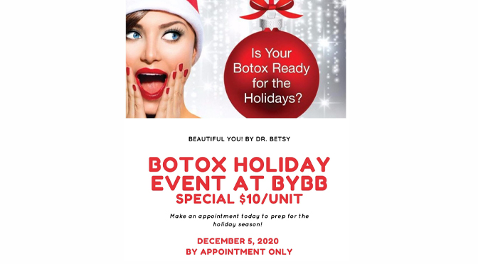 Allentown, PA – December 5th 2020, Dr. Betsy at Beautiful You! By Dr. Betsy will hold a Botox Event at Beautiful You! By Dr. Betsy; 5102 Hamilton Blvd., Allentown PA, 18106, on December 5, 2020, during normal business hours; featuring special rates of $10 per unit for Botox. Now is the perfect time to take advantage of this great rate for Botox to prep yourself for the Holiday Season.