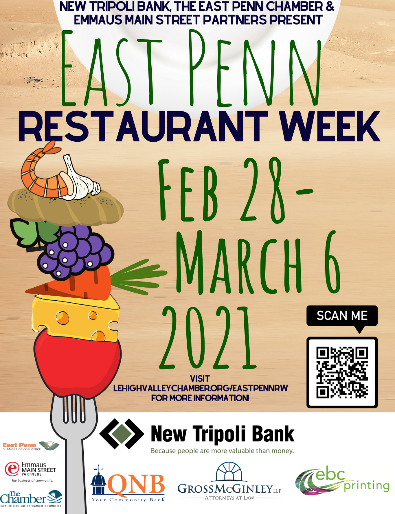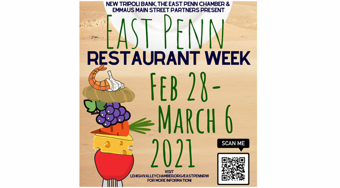 Each year the East Penn Chamber and the Emmaus Main Street Partners organize the East Penn Restaurant Week for eateries in Emmaus, Alburtis, Macungie, Lower Macungie, and Upper Milford to help them gain awareness and increase business during a traditionally slow time of year. Support our local businesses from February 28 – March 6 throughout the East Penn community! Depending on current mandates, there will be dine-in options but either way, our restaurants will have take-out options! Enjoy delicious deals from your favorite (and “soon-to-be-favorite”) restaurants!