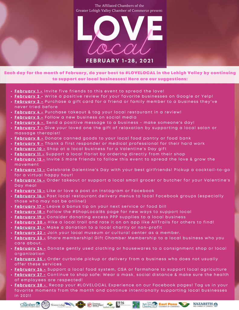 Participants are encouraged to share their experiences from the list of recommendations by using the hashtag #LoveLocal. Reminders of the suggested ways to support and participants’ shared posts will be featured on the Love Local Facebook Event Page, in the Love Local Facebook Group, and on the Affiliated Chambers’ Instagram and LinkedIn pages. Each council of the Affiliated Chambers of the Greater Lehigh Valley Chamber of Commerce will also share reminders on their respective Facebook pages