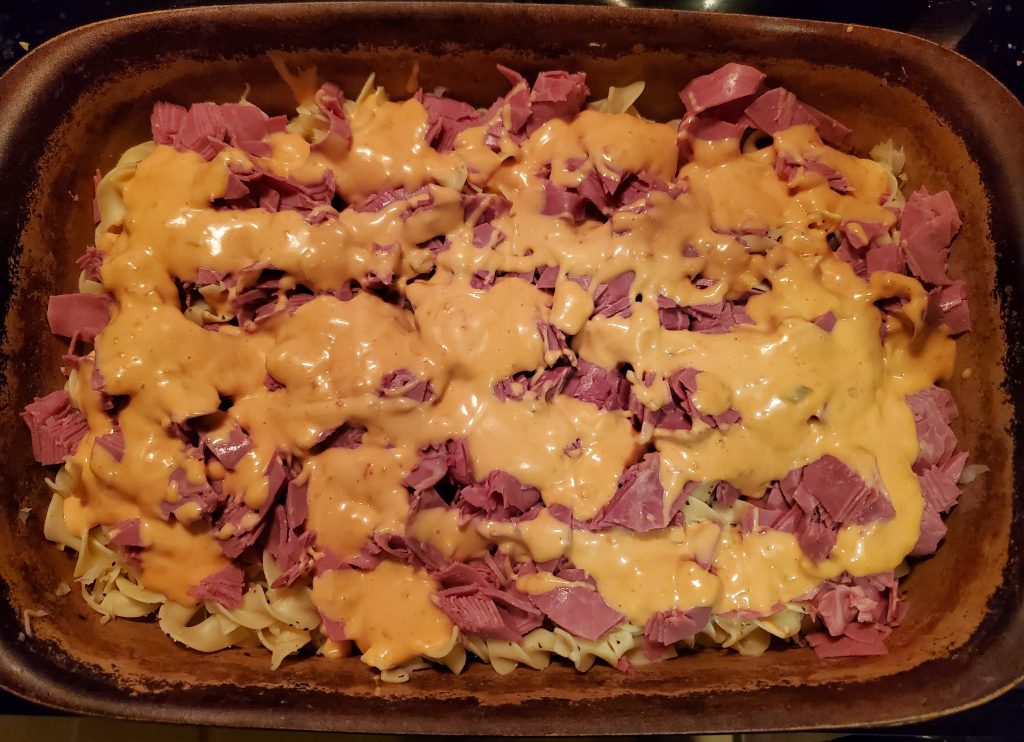 Scatter chopped corned beef over noodle mixture, spread evenly.