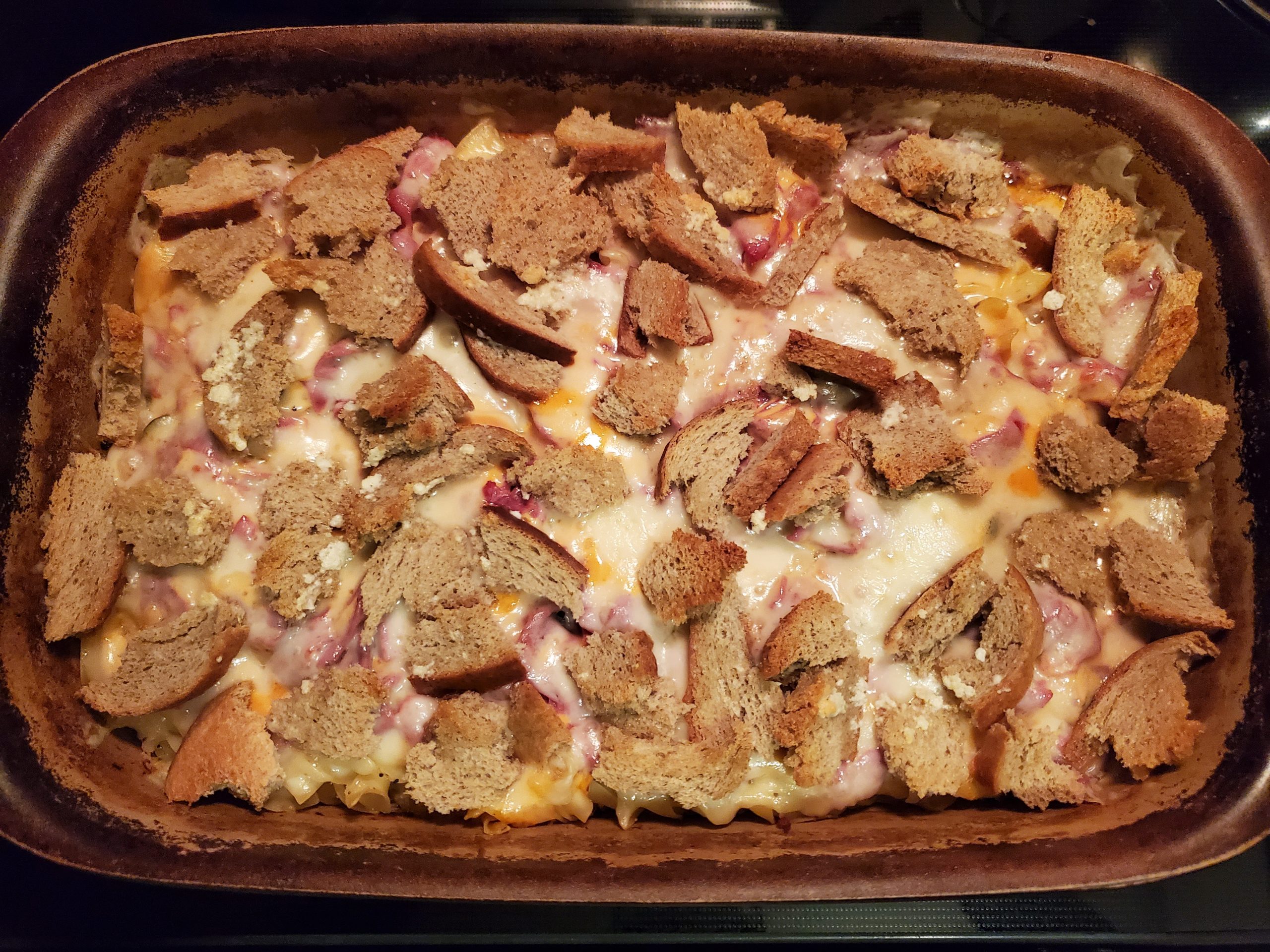This dish is great fresh from the oven, reheating the next day, the bread was soggy.