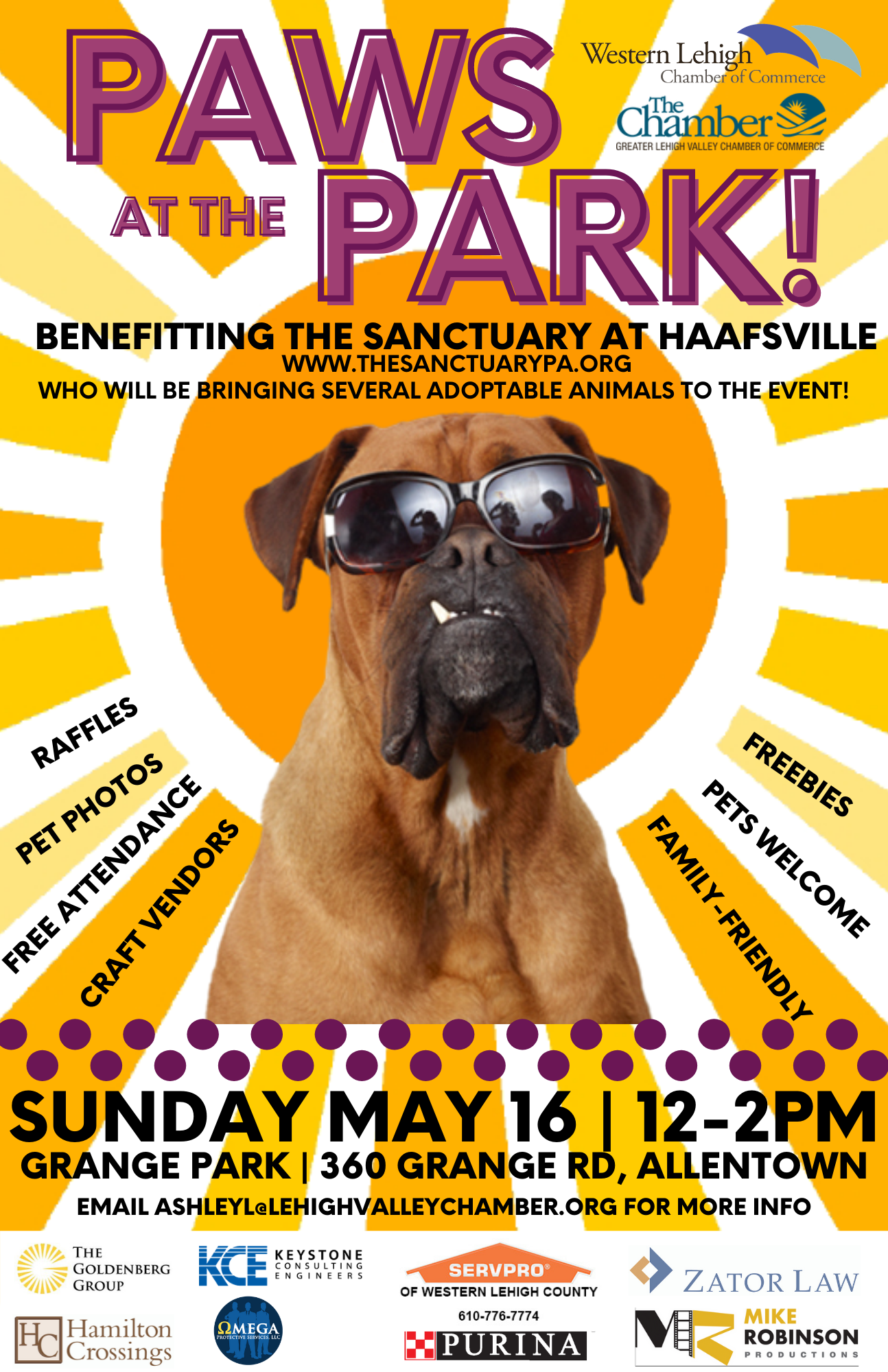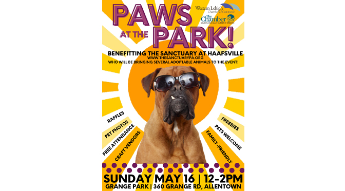 The Western Lehigh Chamber of Commerce is hosting for the first time ever, PAWS AT THE PARK! This is a pet-friendly event to benefit the Sanctuary at Haafsville. The Sanctuary at Haafsville is a volunteer-based organization providing nurturing environment for animals in need. Their website is https://www.thesanctuarypa.org/