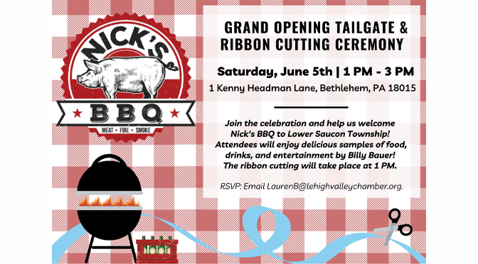 On Saturday, June 5th, from 1 PM to 3 PM, join the Hellertown-Lower Saucon Chamber of Commerce, a proud partner of the Greater Lehigh Valley Chamber of Commerce, as they celebrate the Grand Opening of Nick’s BBQ with a Ribbon Cutting Ceremony and tailgate! The event will kick off with a Ribbon Cutting Ceremony at 1 PM. Attendees will have the opportunity to enjoy delicious food samples, purchase beverages, and listen to entertainment by Billy Bauer. Don’t miss this chance to network and welcome Nick’s BBQ to Lower Saucon Township!