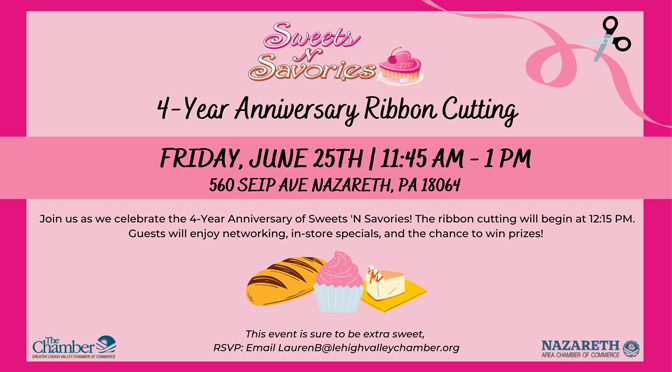 On Friday, June 25th, from 11:45 AM – 1 PM, join the Nazareth Area Chamber of Commerce, a proud partner of the Greater Lehigh Valley Chamber of Commerce, as they celebrate the 4-Year Anniversary of Sweets ‘N Savories with a Ribbon Cutting Ceremony!