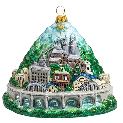 The hand-painted glass ornament, made in Europe and created by master ornament artisans, pays homage to the Bethlehem, PA cityscape and features familiar landmarks, such as the Bethlehem Steel blast furnaces, the steeple of Central Moravian Church, Historic Main Street and other architectural gems, well recognized by locals and visitors alike. Since being officially christened “Christmas City, USA,” in December of 1937, Bethlehem has always taken great pride in their holiday traditions and is often visited by guests from around the world to celebrate all the magic that the Christmas City has to offer.