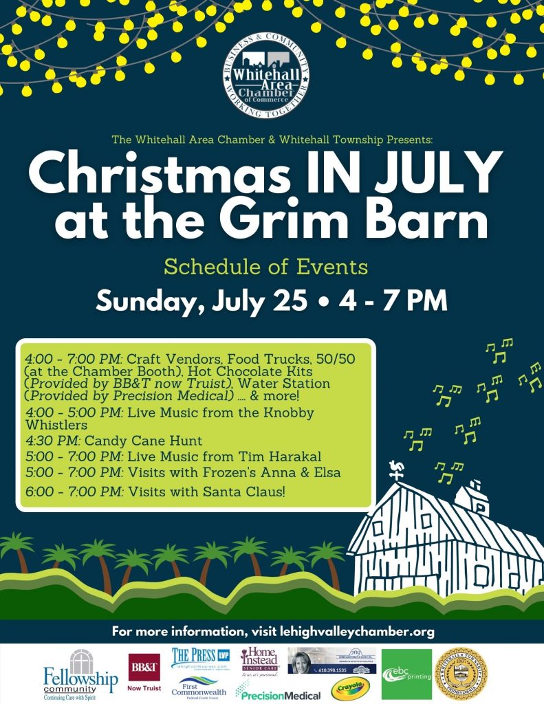 The Whitehall Area Chamber of Commerce, proud partner of the Greater Lehigh Valley Chamber, is pleased to present the first ever “Christmas [in July] at the Grim Barn” on Sunday, July 25th from 4-7 PM. Partnering with Whitehall Township, this family-friendly event is designed to support local businesses with a festive atmosphere at the historic Grim Barn property on Lehnert Road. With over 40 craft and business vendors, as well as a variety of food trucks, live music and children’s activities, the holiday spirit will be live and well in Whitehall.