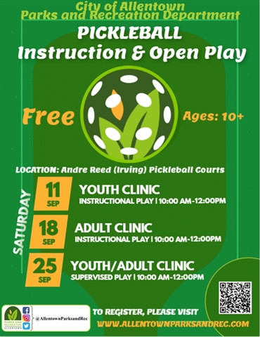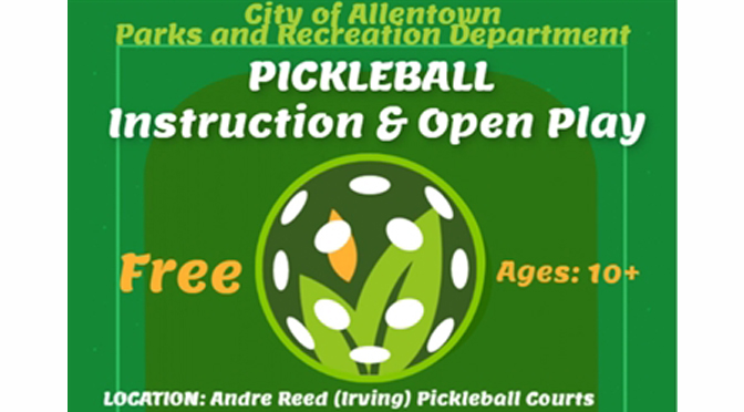 The Allentown Department of Parks & Recreation is offering free pickleball instruction to youth (10+) and adults at Andre Reed (Irving) pickleball/tennis courts on the city’s east side.