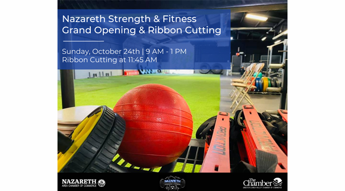 On Sunday, October 24th, join the Nazareth Area Chamber of Commerce, a proud partner of the Greater Lehigh Valley Chamber of Commerce, as they celebrate the Grand Opening of Nazareth Strength & Fitness’ new location with a Ribbon Cutting Ceremony!