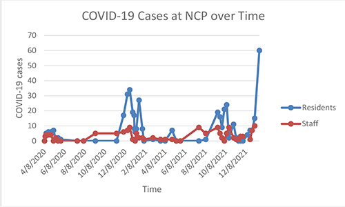 Since March 2020, NCP has conducted 6,813 tests for COVID-19 on inmates. All new inmates are tested when they come into the facility and must show a negative result before they are transferred to General Population; residents are tested on a random basis. PrimeCare Medical does daily temperature checks, movement of inmates is restricted within the facility and meals are served in the housing unit. In-person visitation is prohibited and no volunteers are permitted in the facility. Cloth masks are provided and inmates must wear them whenever they leave their cell. Any inmate participating in work release or work programs within NCP must be vaccinated.
