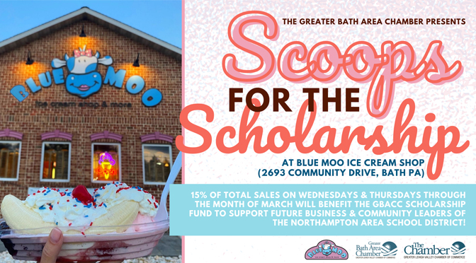 Here’s the scoop! On Wednesdays & Thursdays, throughout the month of March, Blue Moo Ice Cream Shop will donate 15% of their total sales from each day to the Greater Bath Area Chamber’s Scholarship Fund during their Scoop for the Scholarship initiative. The Greater Bath Area Chamber is a proud partner of the Greater Lehigh Valley Chamber of Commerce.