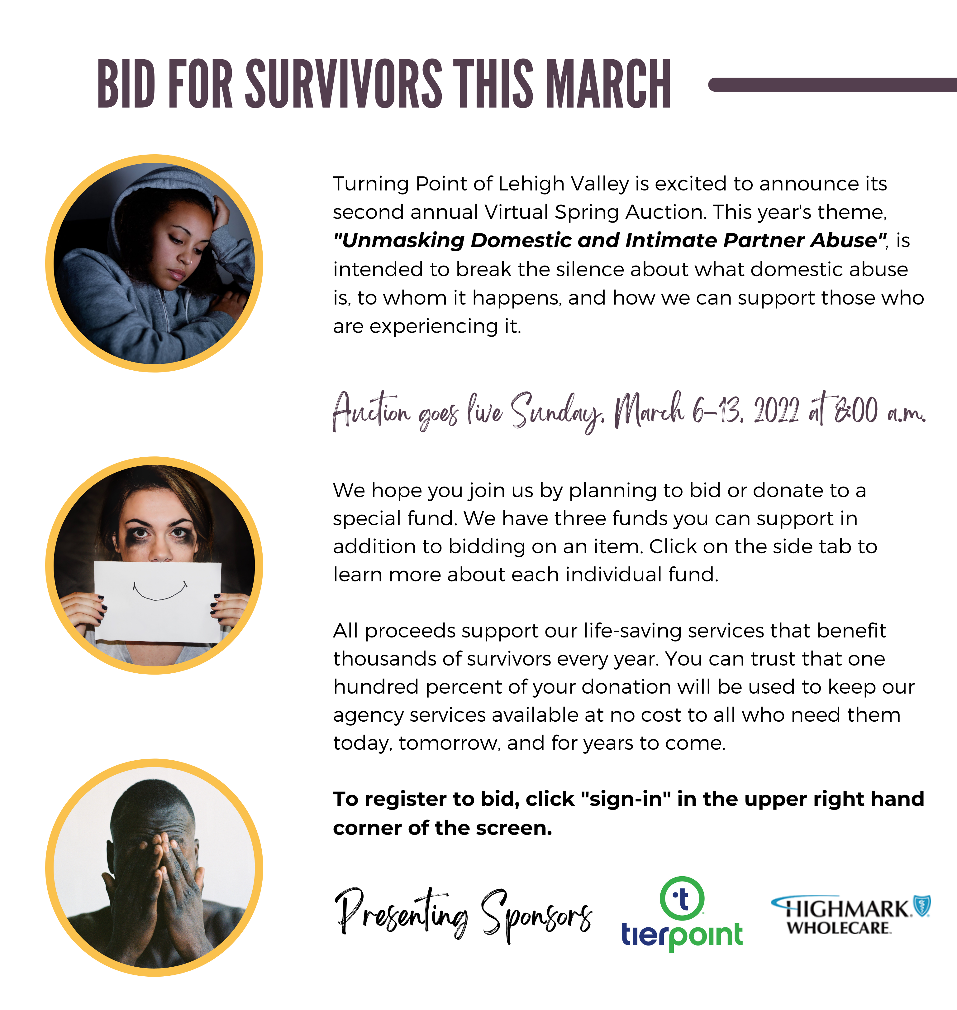 Allentown, PA, March 4, 2022 – Turning Point of Lehigh Valley will host their second annual Virtual Spring Auction during the first full week of March. The auction will be completely online and is scheduled to open on Sunday, March 6, 2022 at 8:00 a.m. and close on Sunday, March 13, 2022 at 8:00 p.m.