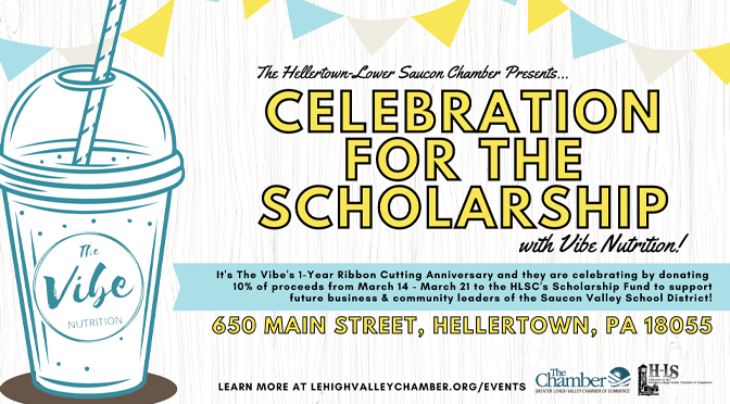 The Vibe Nutrition will donate 10% of sales made from March 14 – March 21 to the Hellertown-Lower Saucon Chamber’s Scholarship Fund to support future business and community leaders of the Saucon Valley School District. “We cannot believe that we cut the ribbon for The Vibe a year ago, it feels like it was just yesterday!”, commented Jessica O’Donnell and Lauren Bertucci, Hellertown-Lower Saucon Chamber liaisons for the Greater Lehigh Valley Chamber of Commerce. “Lauren and her team have become a staple in the Borough in such a short amount of time and we are thrilled that they want to celebrate this momentous occasion by investing in the students of the Hellertown-Lower Saucon community”.