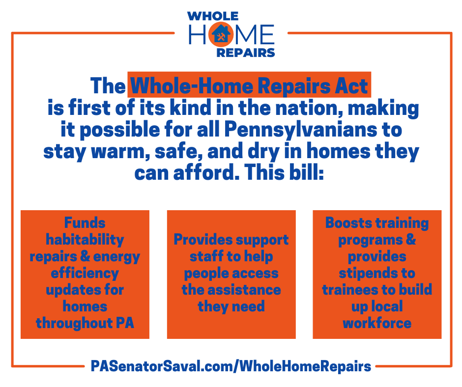 Similar events are being held across Pennsylvania throughout the week as part of the Whole-Home Repairs Act campaign launch. Times and locations of all events, along with partner organizations, are listed at pasenatorsaval.com/WholeHomeRepairs.