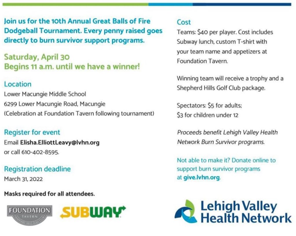 Any questions, let me know! And don’t forget, you can donate to support our burn survivor programs anytime at https://give.lvhn.org – choose “other,” and please add “Dodgeball – McCormac” in the notes. No amount is too small, and every dollar is appreciated!!!