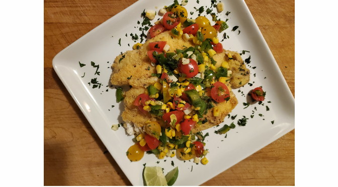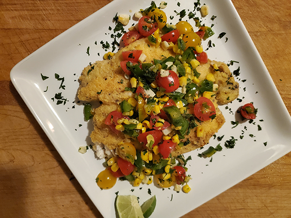 To prepare relish: Heat a dry small saucepan over medium-high heat. Add corn to hot skillet in a single layer, allowing to blister 2-3 minutes before tossing. Cook for 2 more minutes. Transfer to a medium bowl. Add tomatoes, peppers. Stir in parsley, and lime. Marinate for up to 20 minutes, tasting and seasoning accordingly. Set aside while preparing catfish.