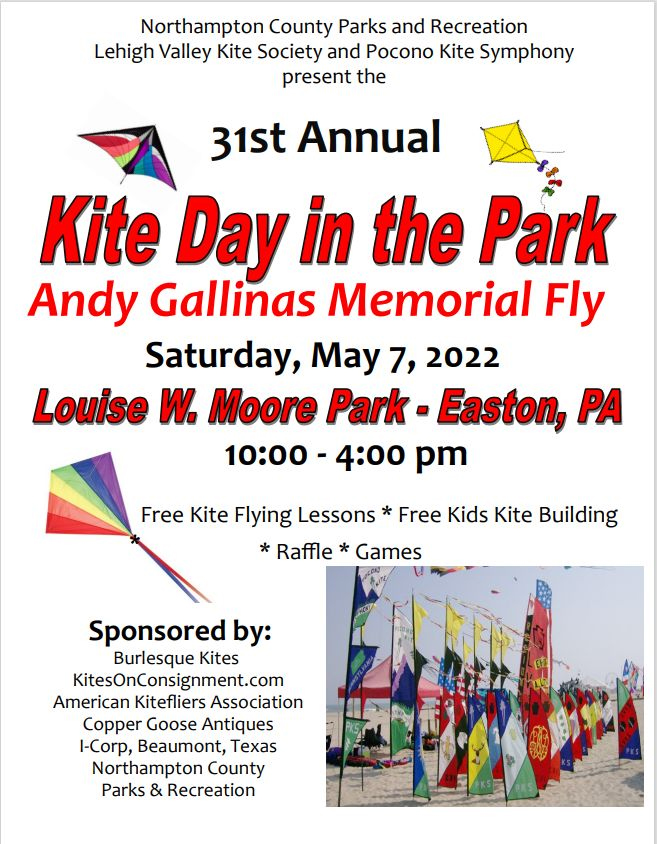 This year’s event will honor Andy Gallinas, who was the founding member of both Lehigh Valley Kite Society and Pocono Kite Symphony. Andy passed away in December 2021.