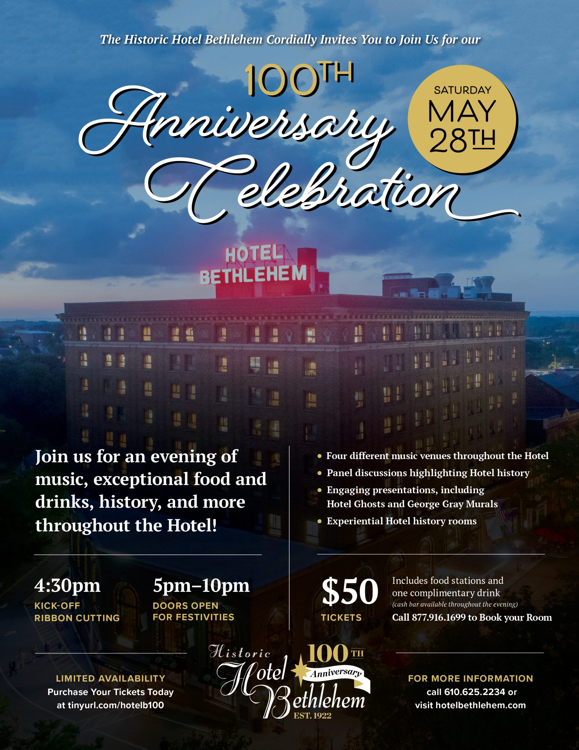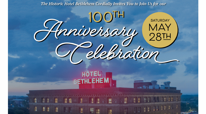 BETHLEHEM, PA – APRIL 20th, 2022 – Historic Hotel Bethlehem is proud to announce their 100th Anniversary Celebration. The Hotel will be hosting an evening of music, exceptional food and drinks, history displays, visits from former famous guests, Former General Managers, and more throughout the Hotel on Saturday evening May 28th.