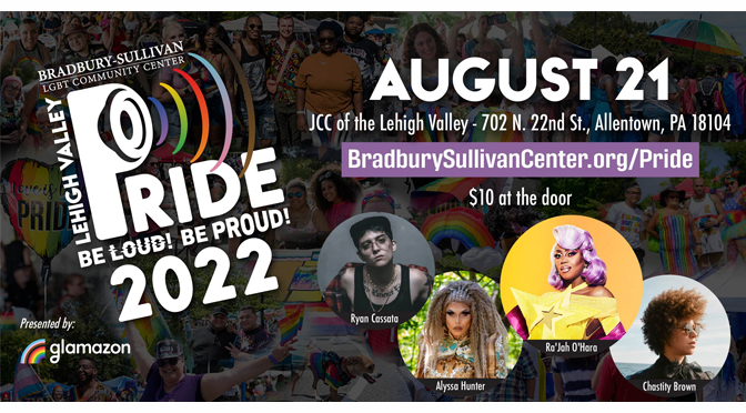 ALLENTOWN, PA – Bradbury-Sullivan LGBT Community Center proudly announces that 2022 Lehigh Valley Pride, presented by glamazon, will take place on Sunday, August 21 from noon to 6 p.m., at the JCC of the Lehigh Valley (702 N. 22nd Street, Allentown, PA 18101).