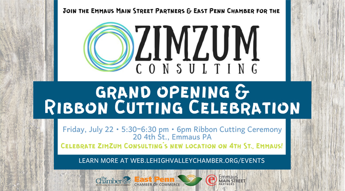 ZimZum Consulting is a collaboration of therapists offering various modes of support located in the Lehigh Valley. Previously at 191 Main Street in the office building, the team has now moved to their own location at 20 S 4th Street, Emmaus, PA 18049. We are looking forward to celebrating this big move with a ribbon cutting ceremony at 6pm on Friday July 22, 2022.