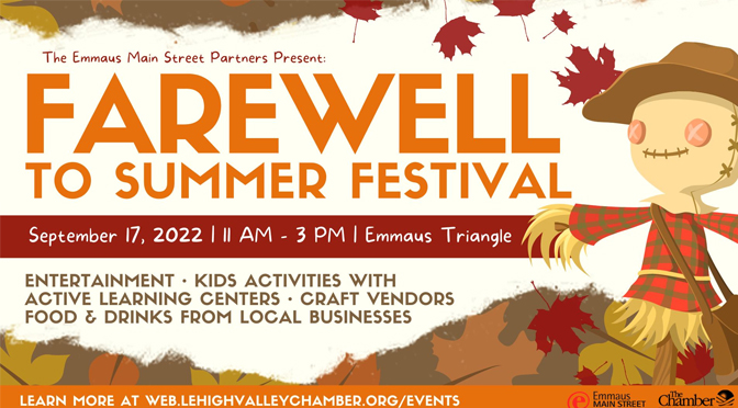 No one is ready for summer to end but make it more fun by joining the Emmaus Main Street Partners for Farewell to Summer Fest! Held at the Emmaus Triangle on Saturday, September 17th from 11am- 3pm, attendees can enjoy live music from Alias for the duration of the event, food from Ridge Runner BBQ and Bananarama as well as our local brick-and-mortar businesses like David’s Italian Market and Armetta’s Restaurant. There will be adult beverages from Yergey Brewing, Funk Brewing and Triple Sun Spirits on site as well.