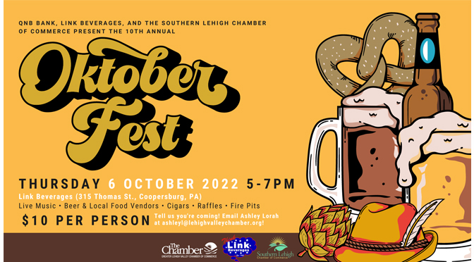 On October 6, join the Southern Lehigh Chamber of Commerce for our 10th Annual Oktoberfest at Link Beverages in Coopersburg at 315 Thomas St. Guests will pay $10 and enjoy delicious food from Potts Hot Dogs, Casa Toro, Carlo’s Pizza, Diana’s Café, and more local restaurants! Guests will also enjoy beer samples from various breweries including local favorites like Yergey Brewing. There will be fire pits for s’mores and live music from Adam Kincaid. Win raffles to benefit the newly formed Southern Lehigh Chamber Scholarship fund.