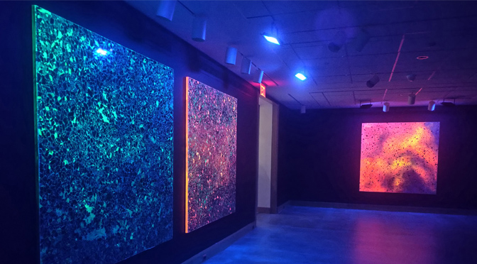 Several of the works on display were created for the exhibition and include in their composition fluorescent minerals sourced from the former Sterling Hill Mine in Ogdensburg, New Jersey.