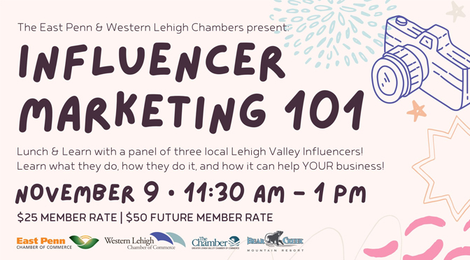 Tickets are $25 for Members and $50 for Future Members. Register at: https://web.lehighvalleychamber.org/events/Influencer-Marking-101-Influencer-Lunch-Learn-EPCC-WLCC–838780/details?fbclid=IwAR15iZMin91khcWY69I8YZY7LmgKsQqHzNCBbqp41MGEoNxEa2ODuJpclE
