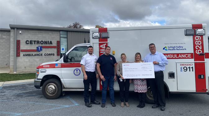 Featured Image: Breast Cancer Check Presentation (Left to Right: Edwin Boyle, Director of Operations of Cetronia Ambulance Corps; Paramedic Chris Sholley of Cetronia Ambulance Corps; Amy Ninos, Chief Financial Officer of Cetronia Ambulance Corps; Amy Burrows, Annual Giving Officer of Lehigh Valley Health Network; Robert F. Mateff Sr., Chief Executive Officer of Cetronia Ambulance Corps)