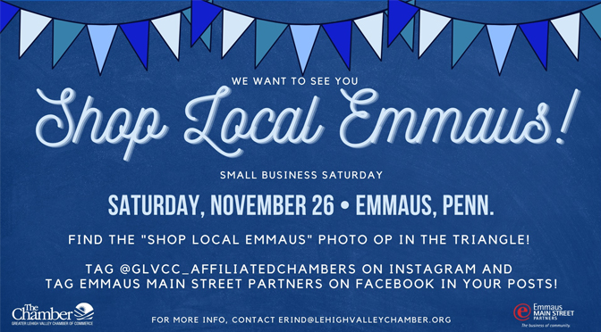 While you are shopping around Emmaus, be sure to grab a picture with our Shop Local Emmaus photo op in the Triangle provided by Vinyl Press. Post your Small Business Saturday pictures on social media and tag GLVCC_AffiliatedChambers on Instagram or Emmaus Main Street Partners on Facebook!