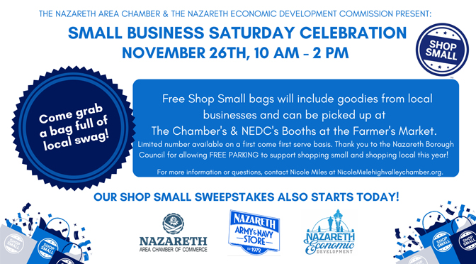 The Nazareth Area Chamber of Commerce and the Nazareth Economic Development Commission (NEDC) are bringing Small Business Saturday back again this year to downtown Nazareth on Saturday, November 26th from 10am-2pm, encouraging shoppers to come downtown and support local, small businesses as they begin their holiday shopping.