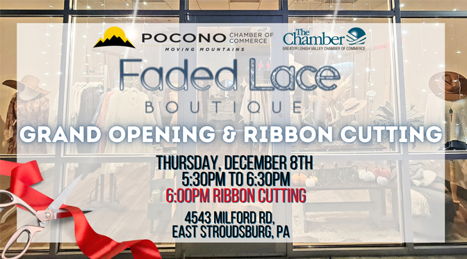Just in time for the holiday season, a new boutique has arrived in town! The Pocono Chamber of Commerce is so excited to help Faded Lace Boutique in East Stroudsburg celebrate their grand opening this Thursday December 8th from 5:30PM to 6:30PM. The ribbon cutting ceremony will begin promptly at 6:00PM.